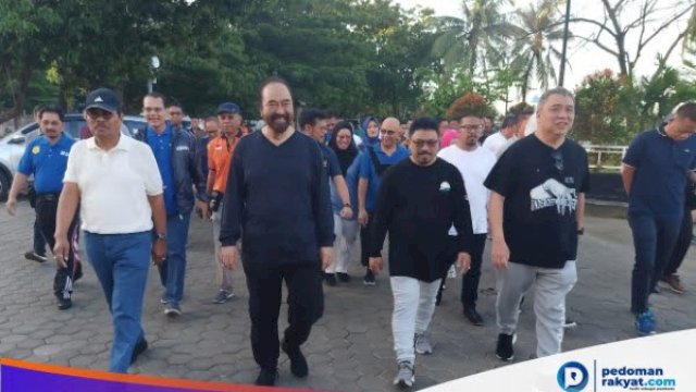 Pedomam Rakyat, Makassar – Ketua Umum NasDem Surya Paloh dalam kunjungan Politiknya ke Makassar menyempatkan Jongging di Kawasan Pantai Losari Makassar, Sabtu (25/01/2020). Surya Paloh turut didampingi Wakil Ketua NasDem Ahmad Ali, Mantan Jaksa Agung HM Prasetyo, Menteri Pertanian Syahrul Yasin Limpo, Sekretaris NasDem Sulsel, Syaharuddin Alrif, Ketua DPRD Makassar Rudianto Lallo dan Kader Partai NasDem Sulsel, Danny Pomanto.