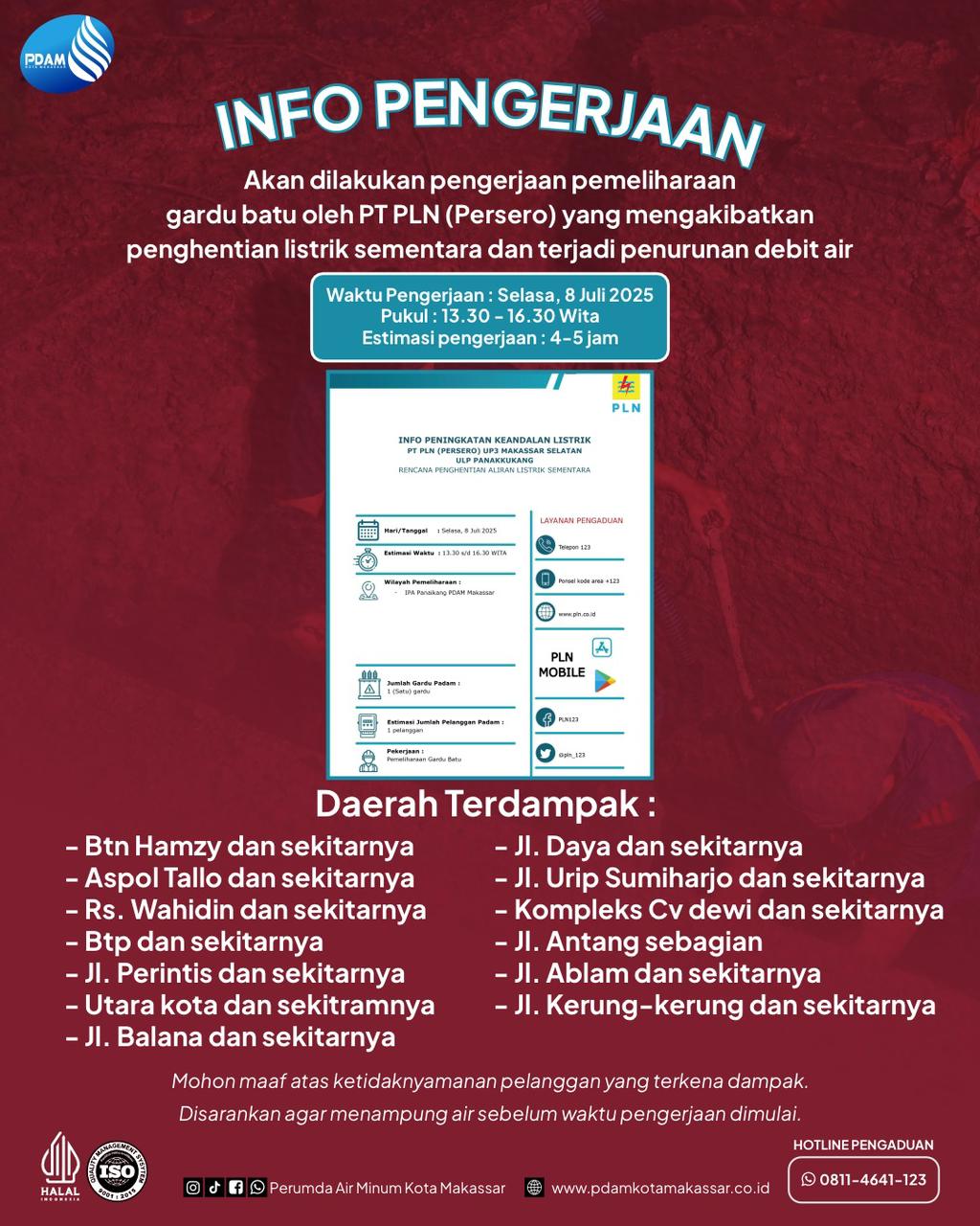 “Waktu pengerjaan Selasa, 8 Juli 2025. Pukul 13.30-16.30 dengan estimasi waktu pengerjaan 4-5 jam,” tambah PDAM Makassar.