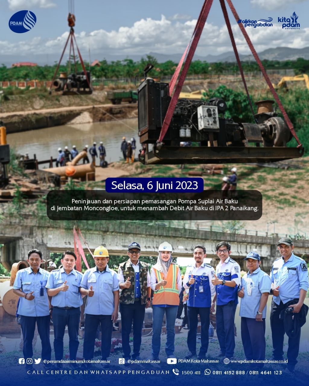 Melihat kondisi tersebut, Perumda Air Minum Kota Makassar bersama PT Traya Tirta Makassar yang mengelola IPA 2 Panaikang, mulai hari ini, Selasa, 6 Juni 2023 menurunkan pompa suplesi di bawah Jembatan Nipa-Nipa Moncongloe untuk mengambil air baku di aliran Sungai Tello.