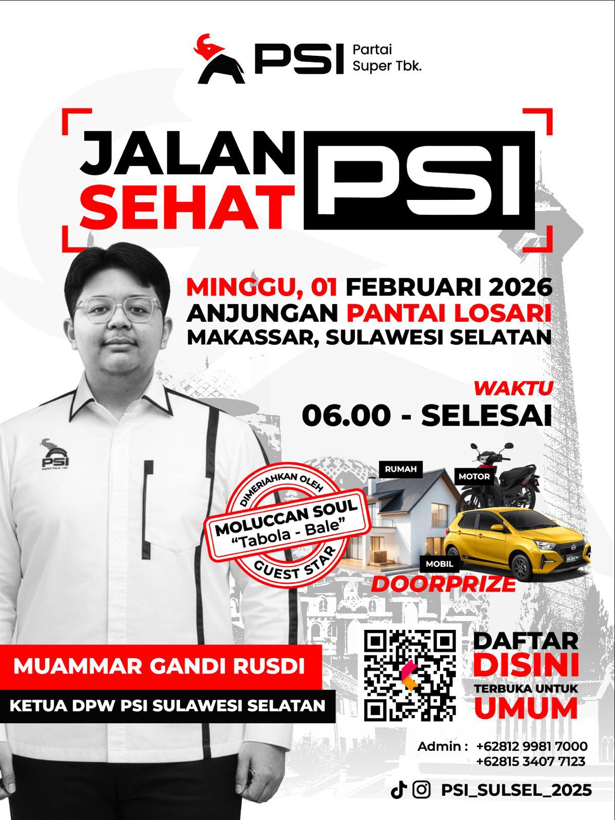 Pedomanrakyat.com, Makassar- Partai Solidaritas Indonesia (PSI) Sulawesi Selatan mengajak masyarakat untuk menghadiri Jalan Sehat PSI Sulsel yang akan digelar di Anjungan Pantai Losari, Makassar, pada Minggu, 1 Februari 2026, mulai pukul 06.00 WITA.