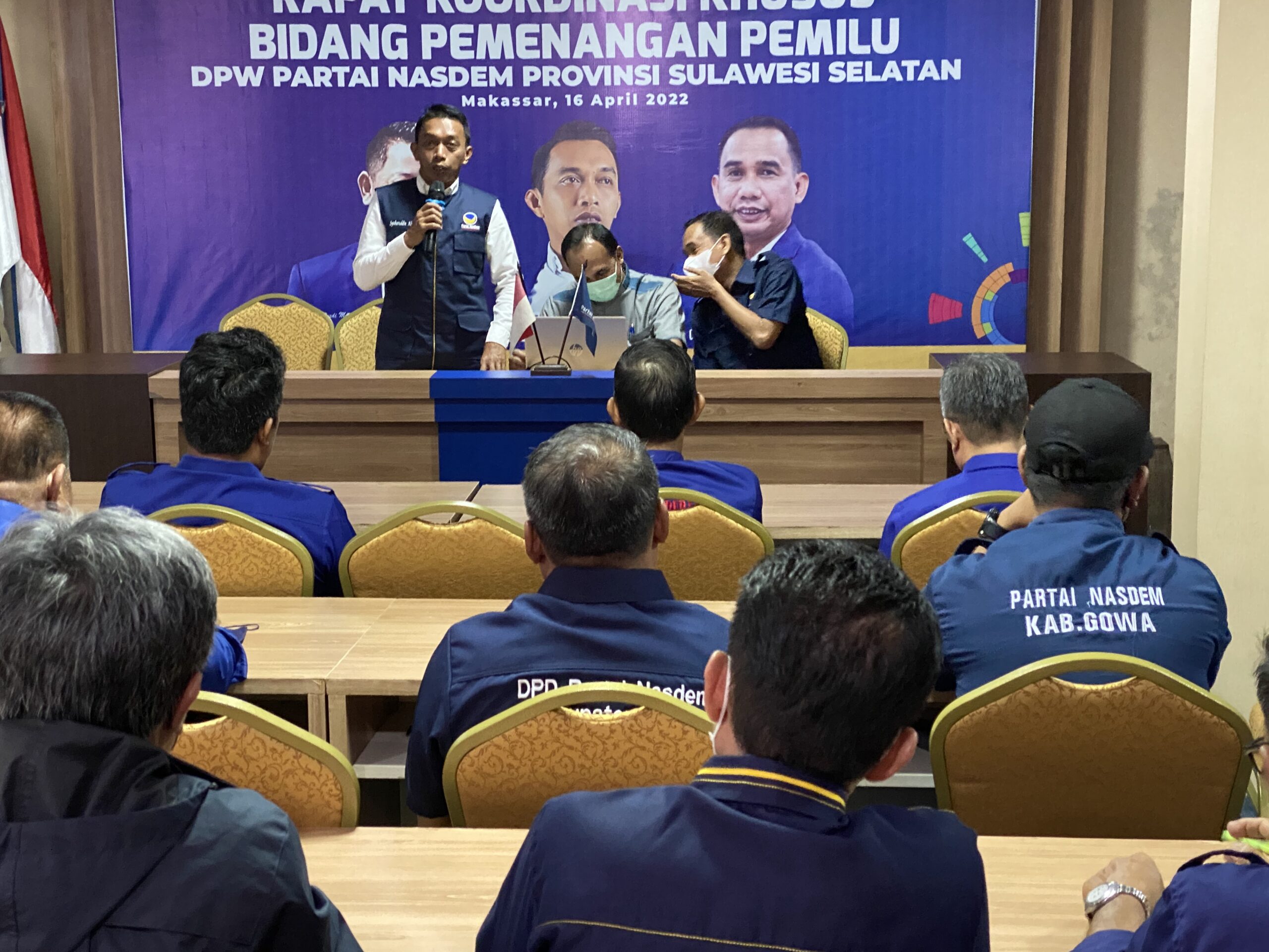 Didampingi, Sekretaris DPW NasDem Sulsel Syaharuddin Alrif dan Rudianto Lallo, Ketua KPU Sulsel, Faisal Amir mengatakan partai NasDem adalah partai pertama yang mengundangnya materi tahapan pemilu.