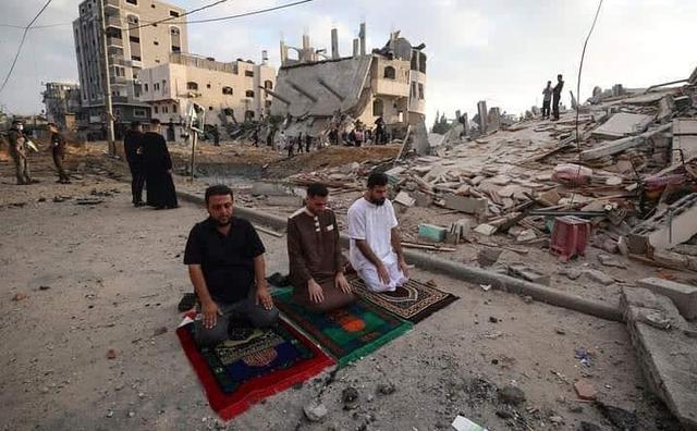 Ada foto beberapa orang disebut sedang melaksanakan shalat Idul Fitri di antara puing-puing reruntuhan.
