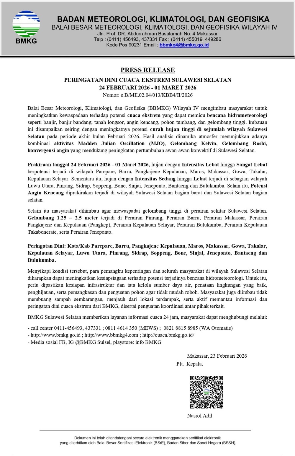 Pedomanrakyat.com, Makassar – Badan Meteorologi, Klimatologi, dan Geofisika (BMKG) mengeluarkan peringatan dini cuaca ekstrem di sejumlah wilayah Sulawesi Selatan yang berlaku pada 24 Februari hingga 1 Maret 2026. Hal ini berdasarkan rilis BMKG (23/2).
