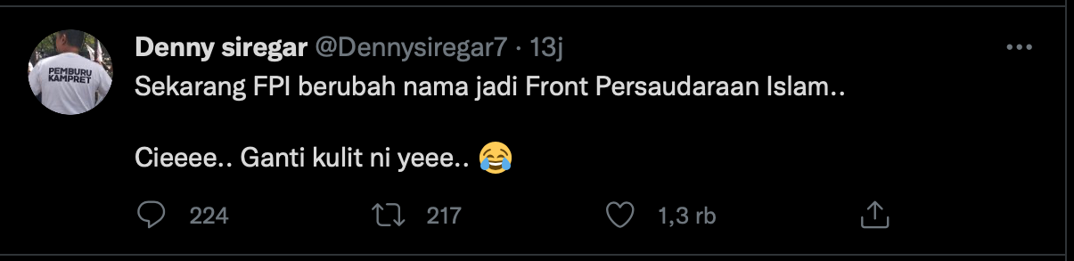 “Sekarang FPI berubah nama jadi Front Persaudaraan Islam. Cieeee.. Ganti kulit ni yeee.,” tulis Denny.