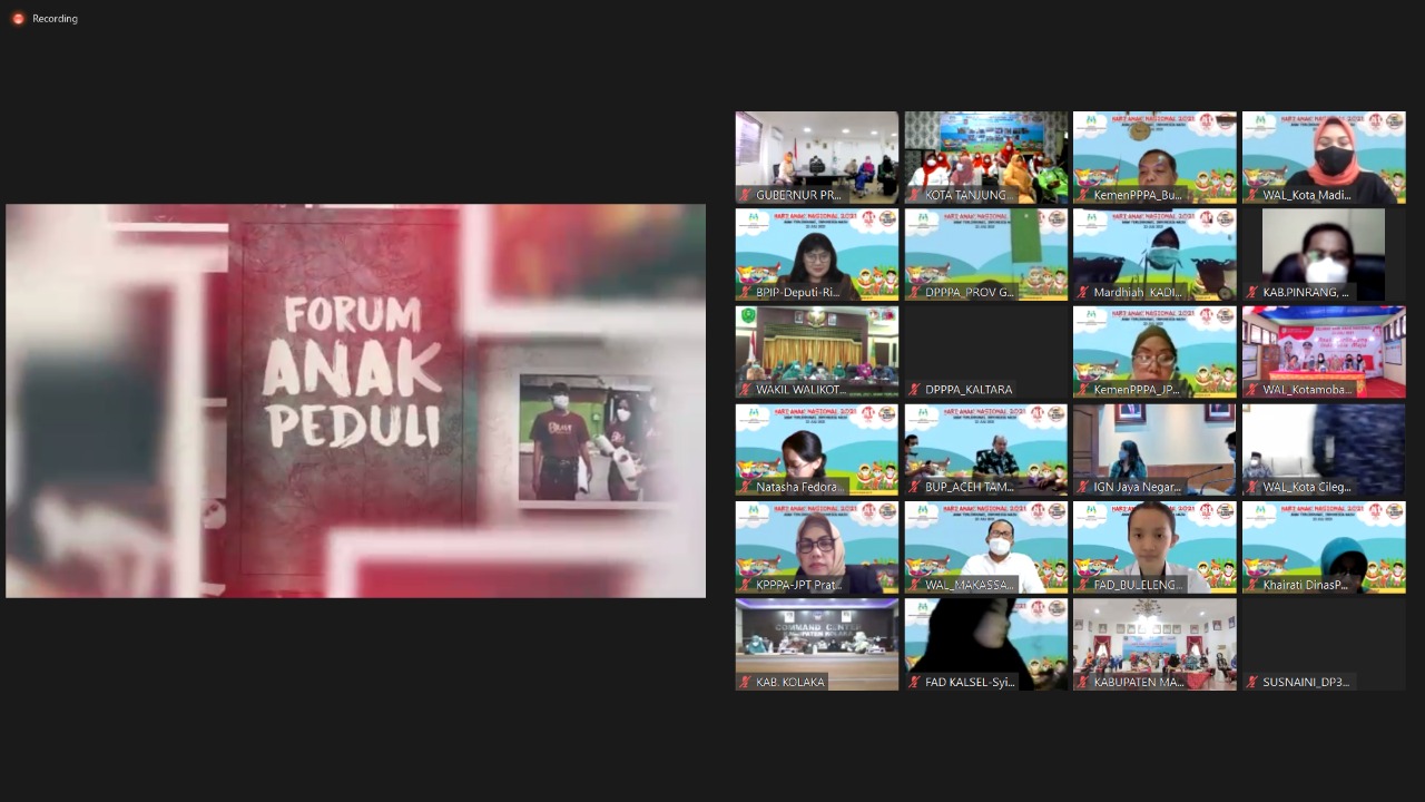 Menteri PPPA RI Bintang Puspayoga juga menyampaikan apresiasinya. Menurutnya, dalam Puncak Peringatan HAN 2021 yang mengangkat tema ‘Anak Terlindungi, Indonesia Maju’ menyampaikan jika semua anak di Indonesia memiliki hak yang sama, termasuk memiliki hak untuk berpartisipasi terhadap pembangunan.