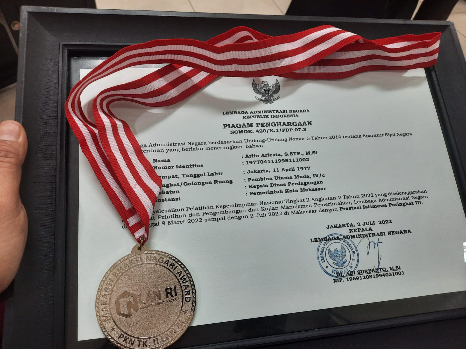 Adapun penghargaan yang diperlole Kepala Disdag Makassar, Pertama, berhasil menyelesaikan PKN dengan prestasi istimewa peringkat ke 3 dari 60 peserta se-Indonesia.