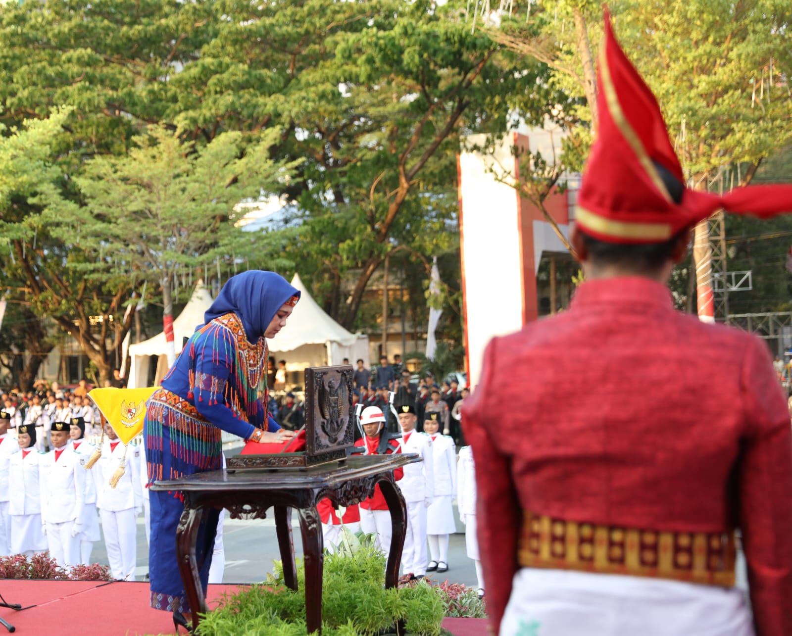 Pedomanrakyat.com, Makassar – Wakil Wali Kota Makassar, Fatmawati Rusdi selaku inspektur upacara penurunan Bendera Merah Putih, 17 Agustus HUT ke 78 RI, yang di gelar di anjungan pantai losari, Kamis (17/08/2023).