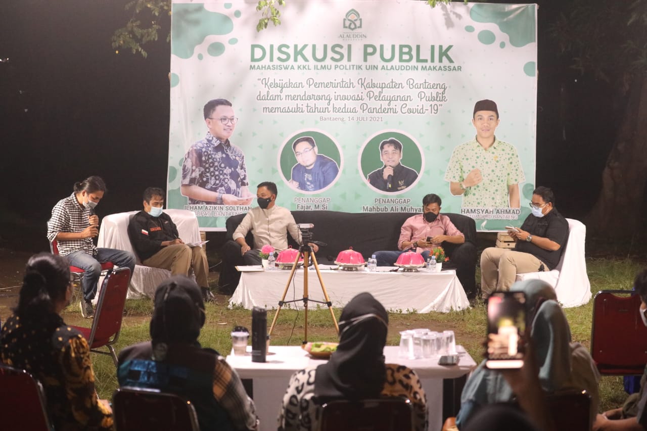 Pedoman Rakyat, Bantaeng – Mahasiswa KKL Ilmu Politik UIN Alauddin Makassar menggelar Diskusi Publik yang mengusung tema Kebijakan Pemerintah Kabupaten Bantaeng Dalam Mendorong Inovasi Pelayanan Publik Memasuki Tahun Kedua Pandemi Covid-19 di Pelataran Balang Institut, Kecamatan Bantaeng, Rabu (15/7) malam.