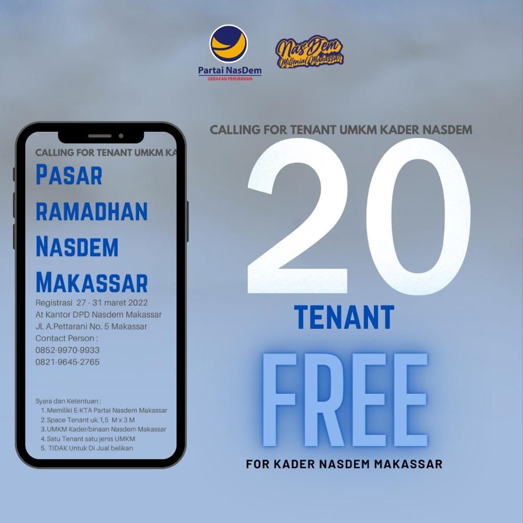 “Untuk space tenantnya itu panitia sudah siapkan, setiap tenant diberikan ukuran 1,5 meter x 3 meter. Kemudian UMKM harus dari kader/binaan Nasdem Makassar, dan setiap tenant satu jenis UMKM. Yang terpenting juga setiap tenant tidak untuk diperjual belikan,” ujar Cicu, Sabtu (26/3/2022).