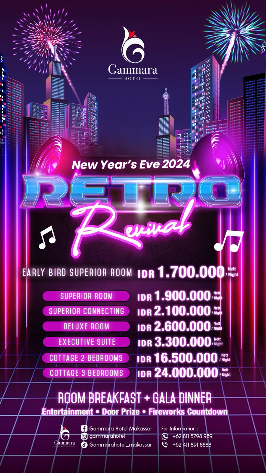 Penawaran Promo Akhir Tahun ‘Retro Revival’ dapat dipesan melalui nomor telepon +62 411 891 8888, whatsapp +62 811 5798 989 atau dapat melalui instagram hotel @gammarahotel.