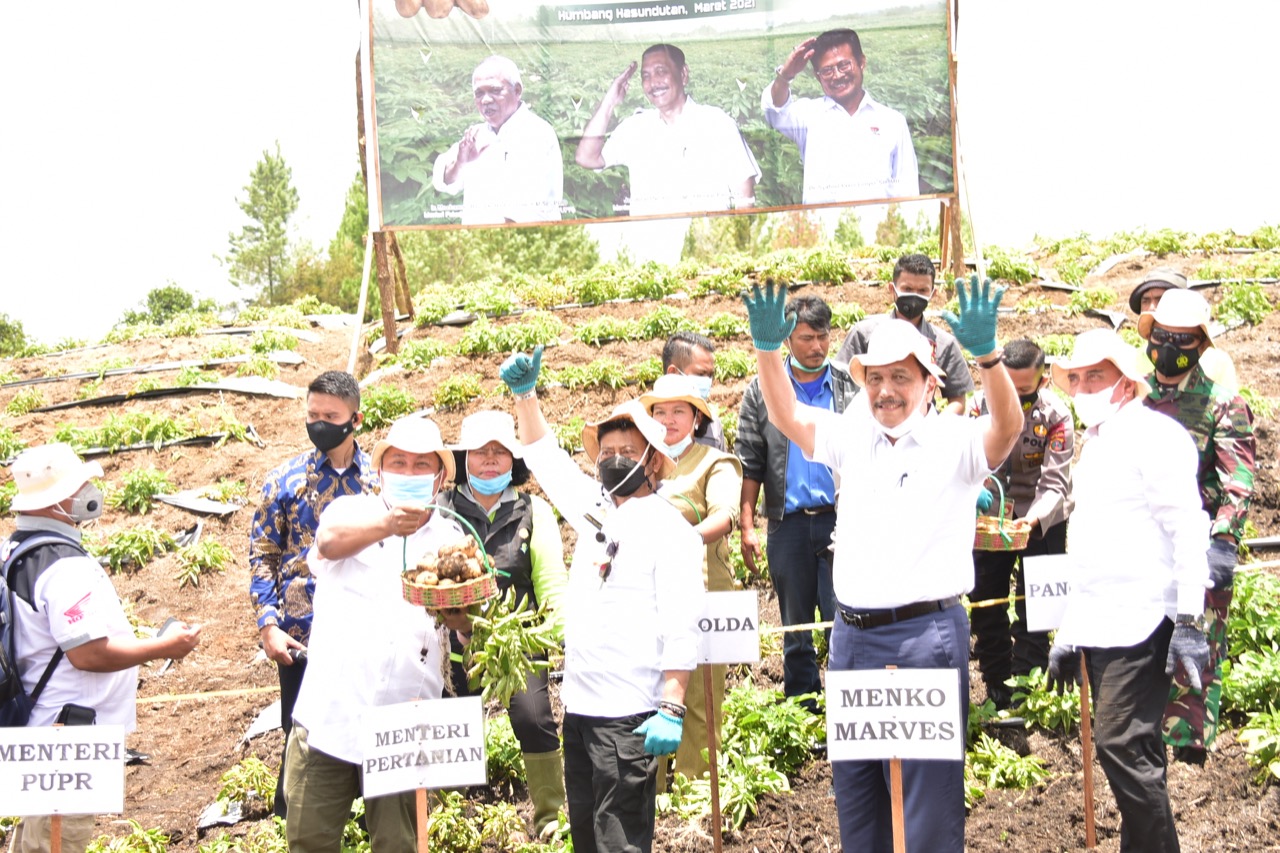 Pedoman Rakyat, Humbahas – Menteri Koordinator Bidang Kemaritiman dan Investasi (Menko Marves), Luhut Binsar Pandjaitan, kembali meninjau kawasan food estate di Kabupaten Humbang Hasundutan (Humbahas), Sumatera Utara, Selasa (23/3/2021). Kehadirannya kali ini didampingi Menteri Pertanian, Syahrul Yasin Limpo (Mentan SYL) dan Menteri Pekerjaan Umum dan Perumahan Rakyat (PUPR), Basuki Hadimoeljono. Luhut meninjau capaian dan perluasan yang ditargetkan.