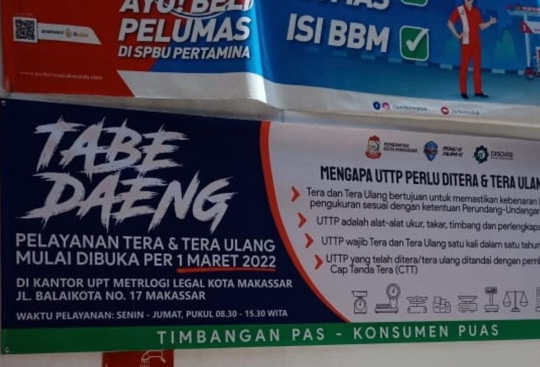 Terlihat, sejumlah spanduk-spanduk soal pelaksanaan UTTP Tera dan Tera Ulang dari Disdag terpasang di sejumlah titik di Wilayah Makassar.