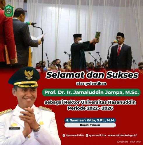 “Selamat mengemban amanah dalam pengabdian memimpin Universitas Hasanuddin demi mencerdaskan kehidupan bangsa dan negara sebagaimana yang diamanatkan dalam undang-undang. Semoga Allah meridhoi,”Ungkap Bupati Takalar Syamsari Kitta.
