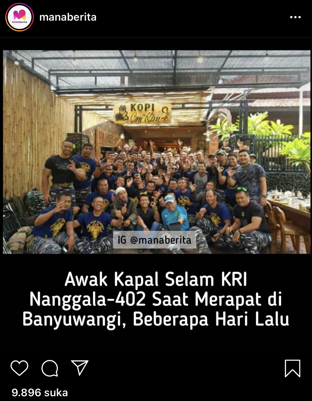 Gambar tersebut pertama kali diunggah akun Instagram @manaberita. Akun yang memiliki pengikut 204ribu mengunggah gambar ke 53 ABK yang berasal dari KRI Nanggala-402 yang sempat mengabadikan momen mereka saat berada di Banyuwangi.