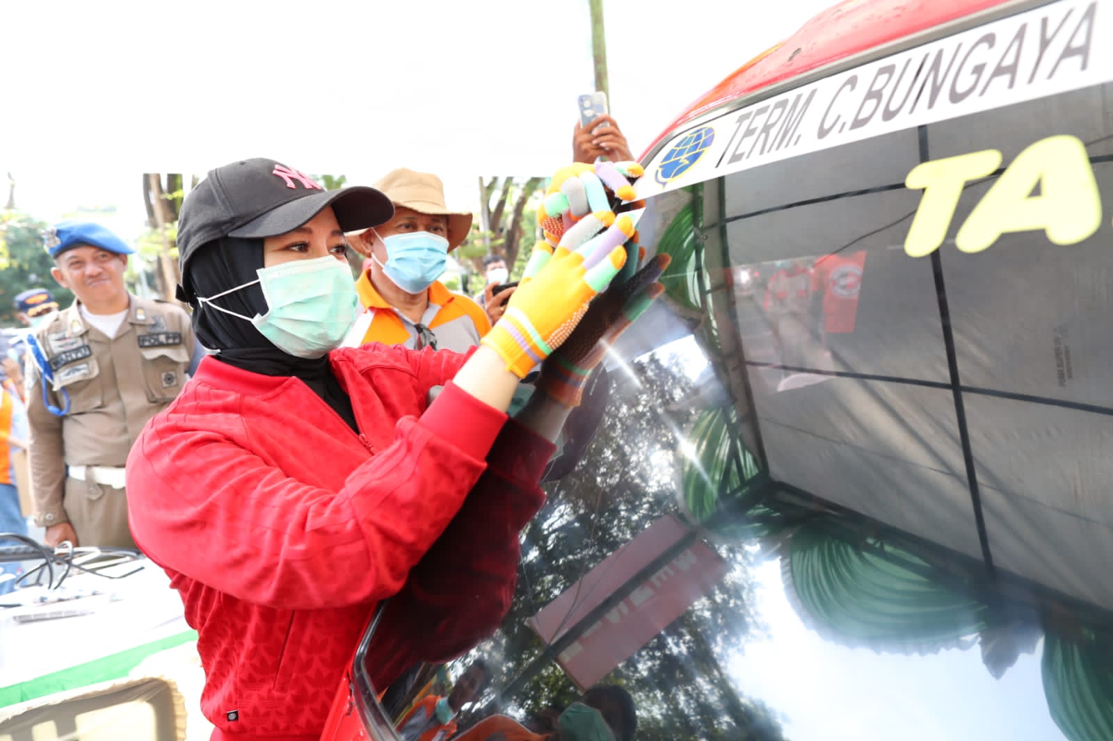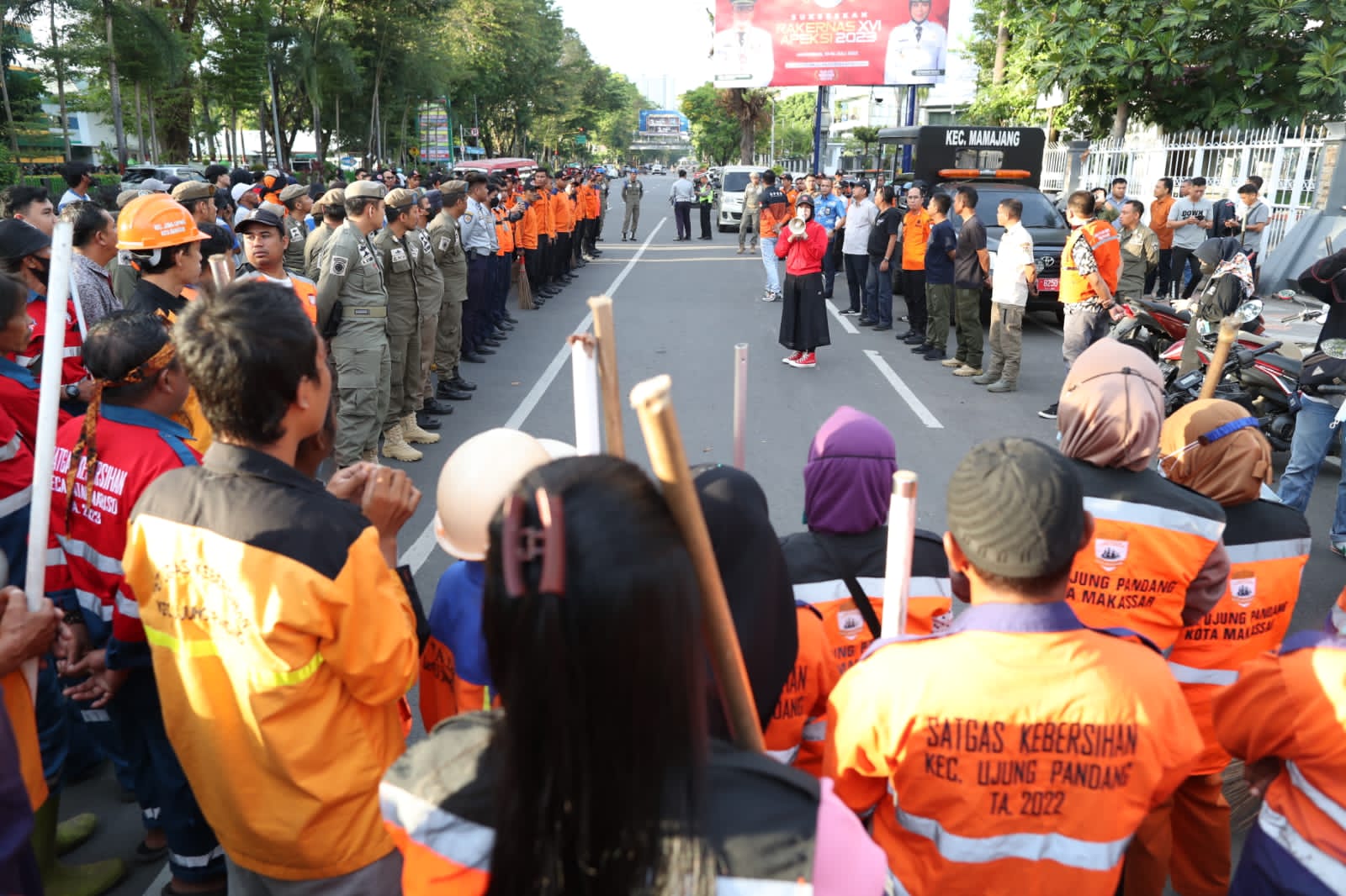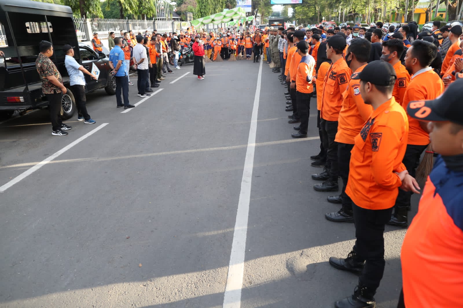 Titik kumpul di depan monumen Mandala, Fatmawati pimpin apel gabungan tim giat bersih yang terdiri dari pasukan orange satgas kebersihan, tim dari Dinas Lingkungan Hidup Daerah, Tim Satpol PP, tim Dishum, BPBD, dan Damkar.