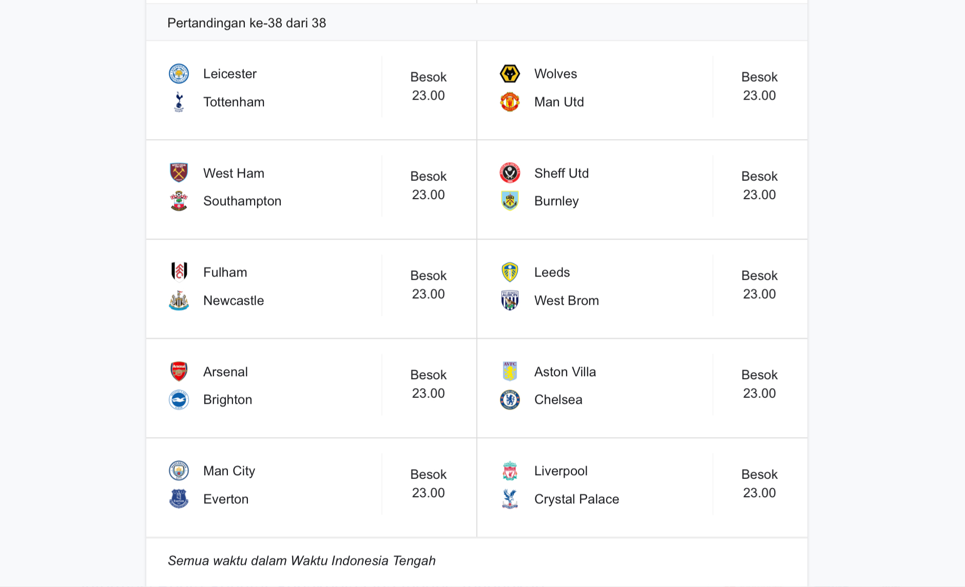 Sementara tiga tim, Fulham, West Bromwich Albion dan Sheffield United sudah dipastikan degradasi. Sebagai catatan, semua laga di pekan terakhir Liga Inggris akan digelar bersamaan. Kickoffnya, Minggu 23 Mei pukul 23.00 Wita.