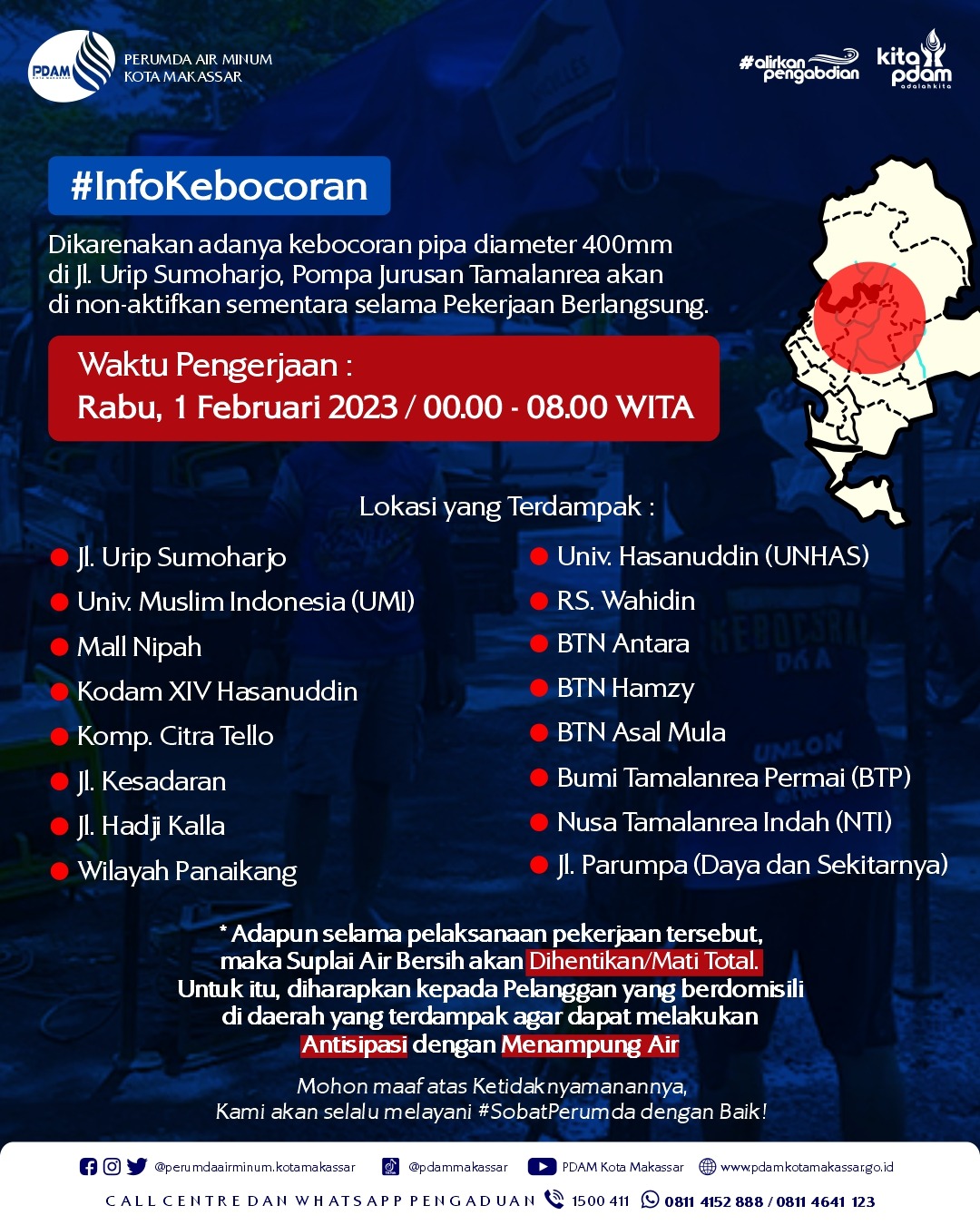 “Kami mohon maaf atas kejadian ini, kami akan berupaya untuk penyelesaian kebocoran. Guna meminimalisir dampak, maka kami imbau agar pelanggan di daerah terdampak dapat menampung air sebelum pompa dimatikan, ” ungkap Asdar.