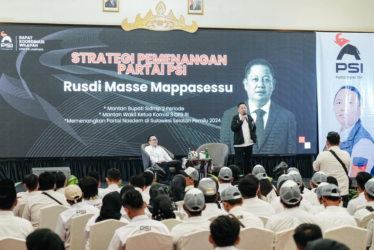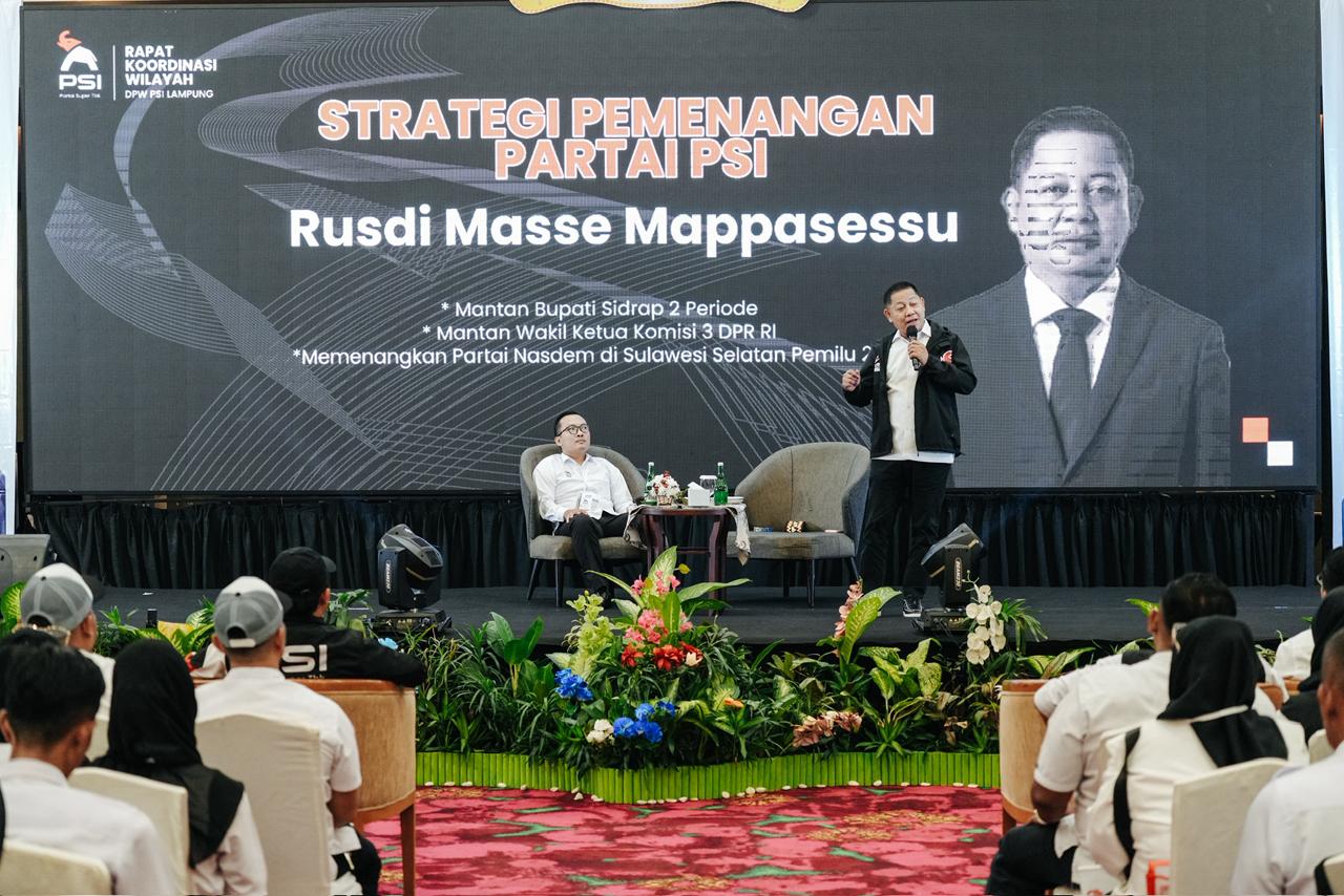 Setibanya di lokasi kegiatan, Rusdi Masse lebih dahulu memberikan pembekalan kepada ribuan kader PSI se-Lampung terkait strategi pemenangan pemilu. Dalam penyampaiannya, RMS sedikit membagikan kisah hidupnya sekaligus memberikan motivasi kepada kader.