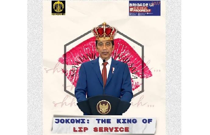 BEM UI mengkritik Presiden Jokowi lantaran sering mengobral janji manis yang kerap tidak direalisasikan. Jokowi dicap sebagai The King of Lip Service alias Raja Membual.
