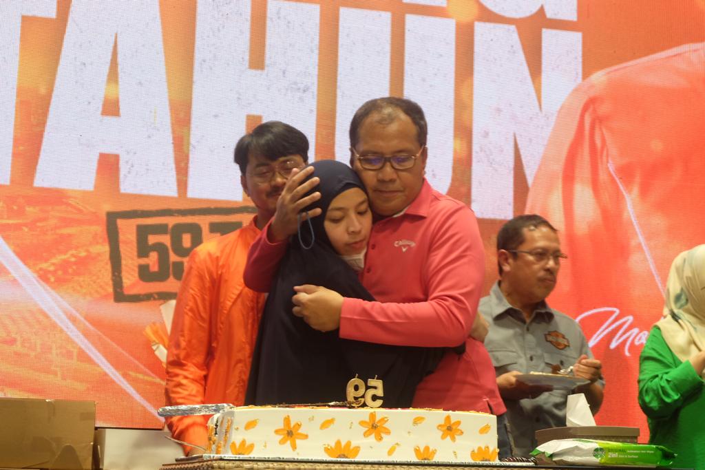 Danny Pomanto yang didampingi oleh anak sulungnya, Aura Aulia Imandara dan menantunya dr. Udin Malik tampak menikmati acara syukuran ulang tahun tersebut yang dibuat oleh SKPD Kota Makassar.