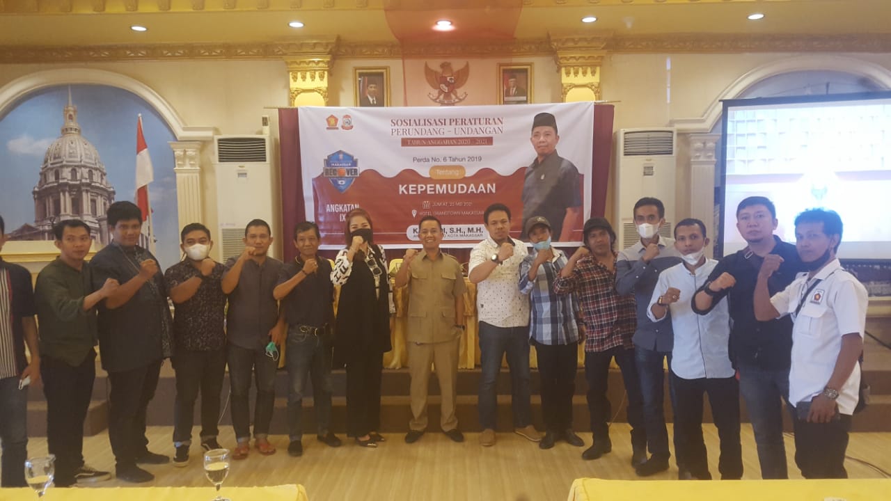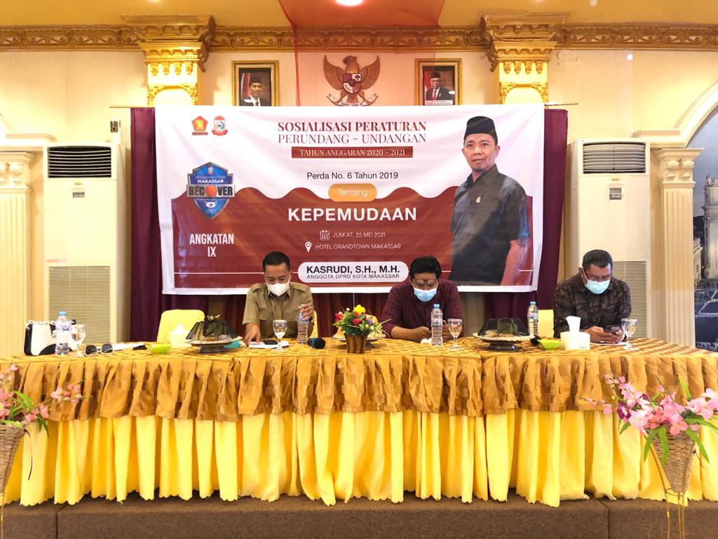 Pedoman Rakyat- Makassar-Anggota DPRD Kota Makassar, dari Partai Gerindra Kasrudi, menyelenggarakan kegiatan sosialisasi Peraturan perundang-undangan tahun anggaran 2021, terkait peraturan daerah (Perda) nomor 6 tahun 2019 tentang Kepemudaan, di Hotel Grand Town, Jumat (25/6/2021).