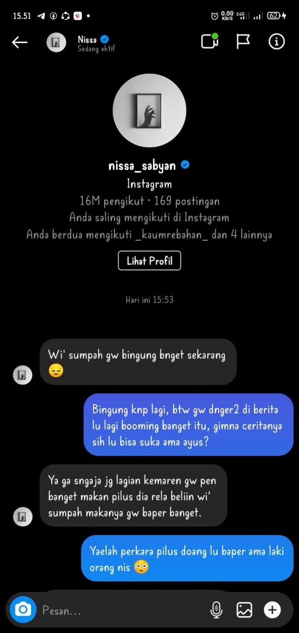 Nissa Sabyan: Ya ga sengaja jg lagian kemaren gw pen banget makan pilus dia rela beliin wi’ sumpah makanya gw baper banget.