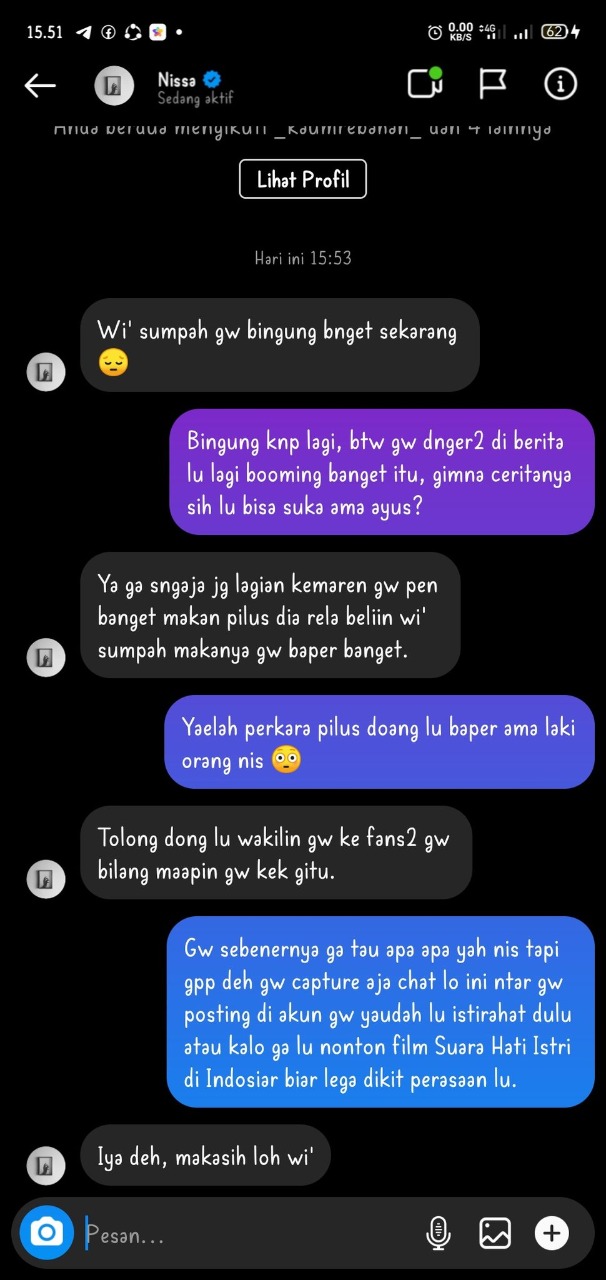 Teman: Gw sebenernya ga tau apa apa yah nis tapi gpp deh gw capture aja chat lo ini ntar gw posting di akun gw yaudah lu istirahat dulu atau kalo na lu nonton film suara hati istri di Indonesiar biar lega dikit perasaan lu.